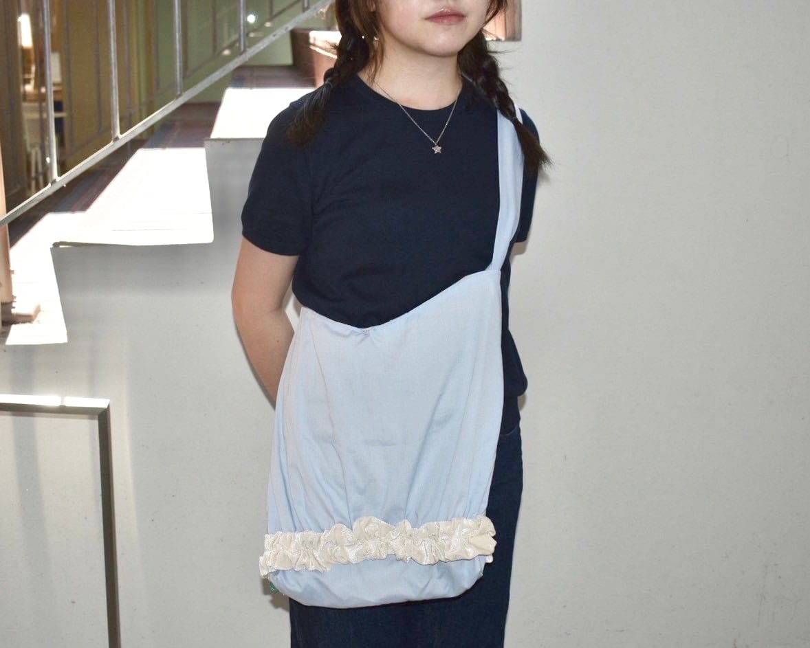 爽やかな薄い水色にくしゅくしゅとした白のデザインがアクセントとなっているショルダーバッグです。暑い夏でも軽やかに涼しく過ごせるようなアイテムになっています。容量が大きいため通学にもぜひ。