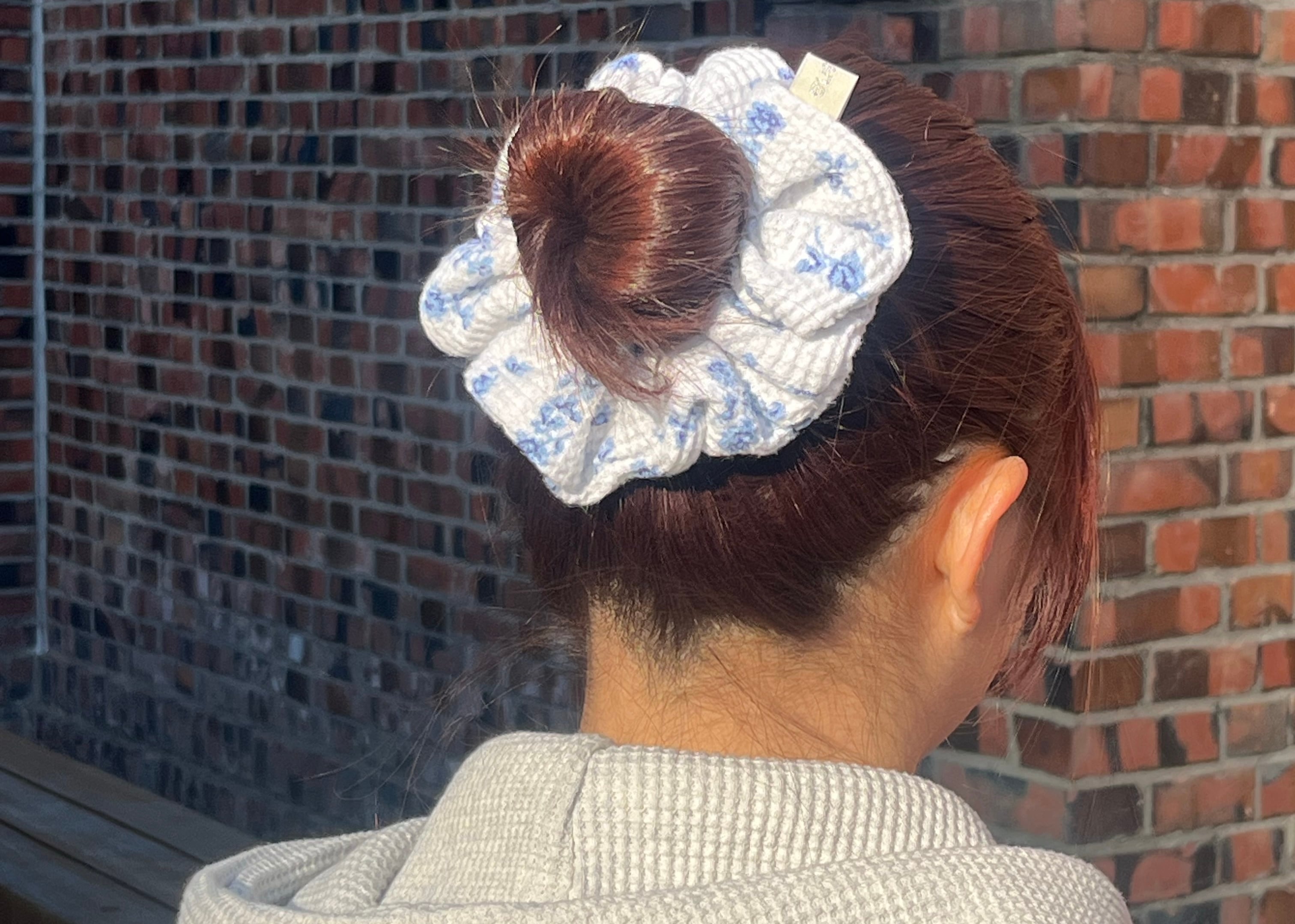 白地に青の小花柄が爽やかで可愛いシュシュです。