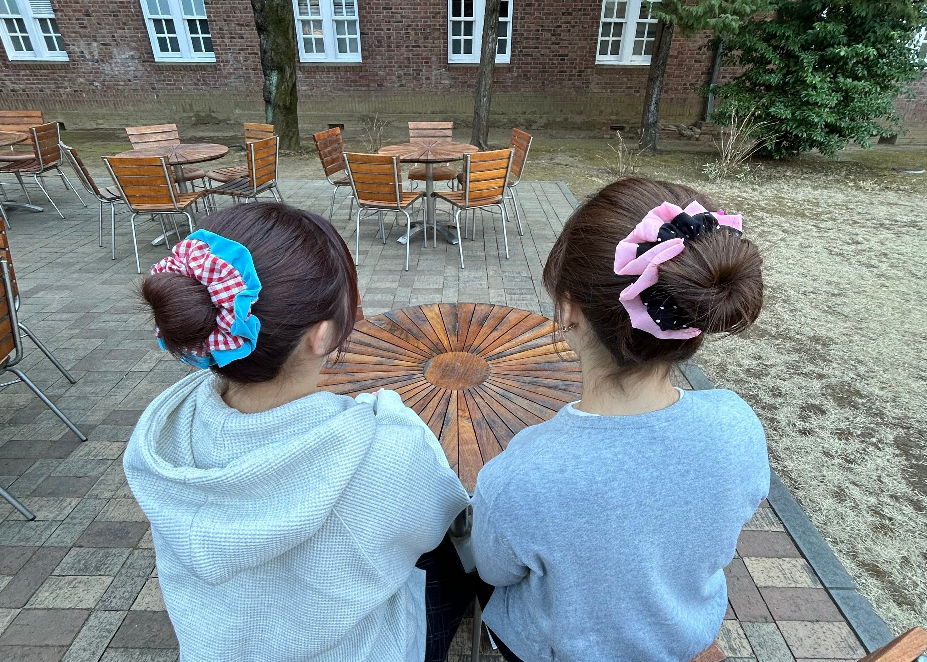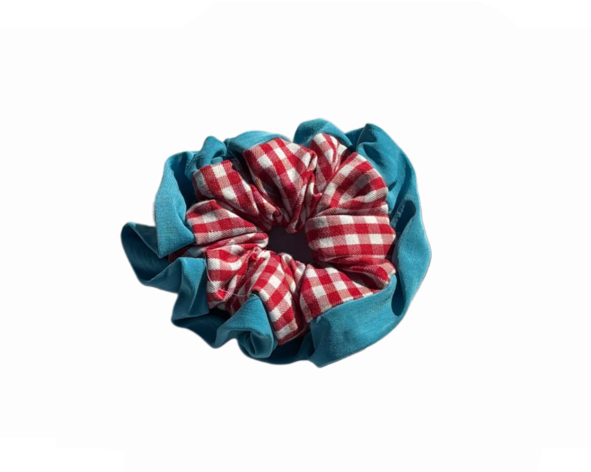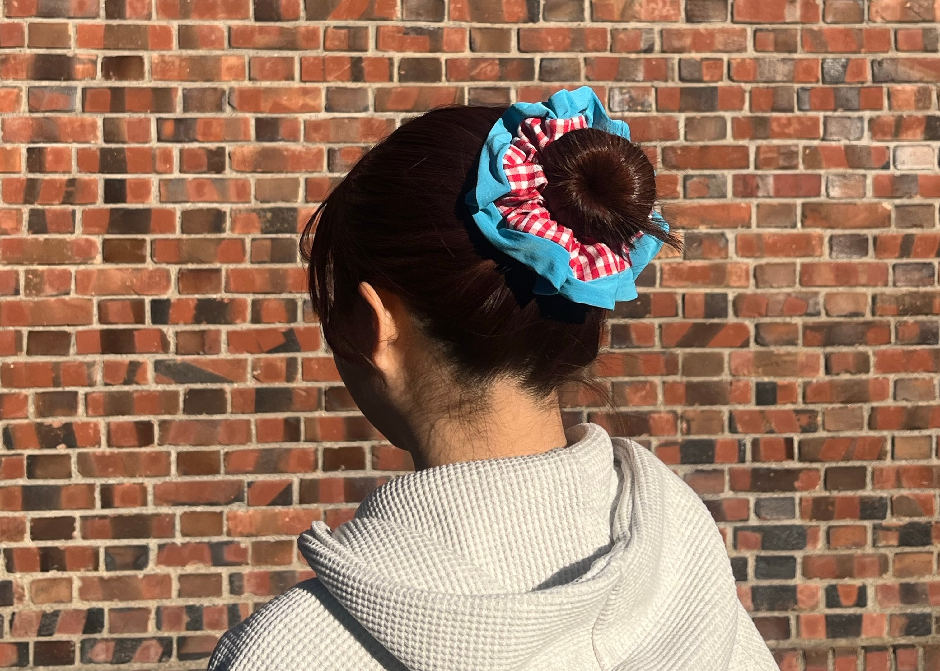 パキッと明るい原色の組み合わせが特徴的なシュシュです。春のおでかけコーデにぴったりです!