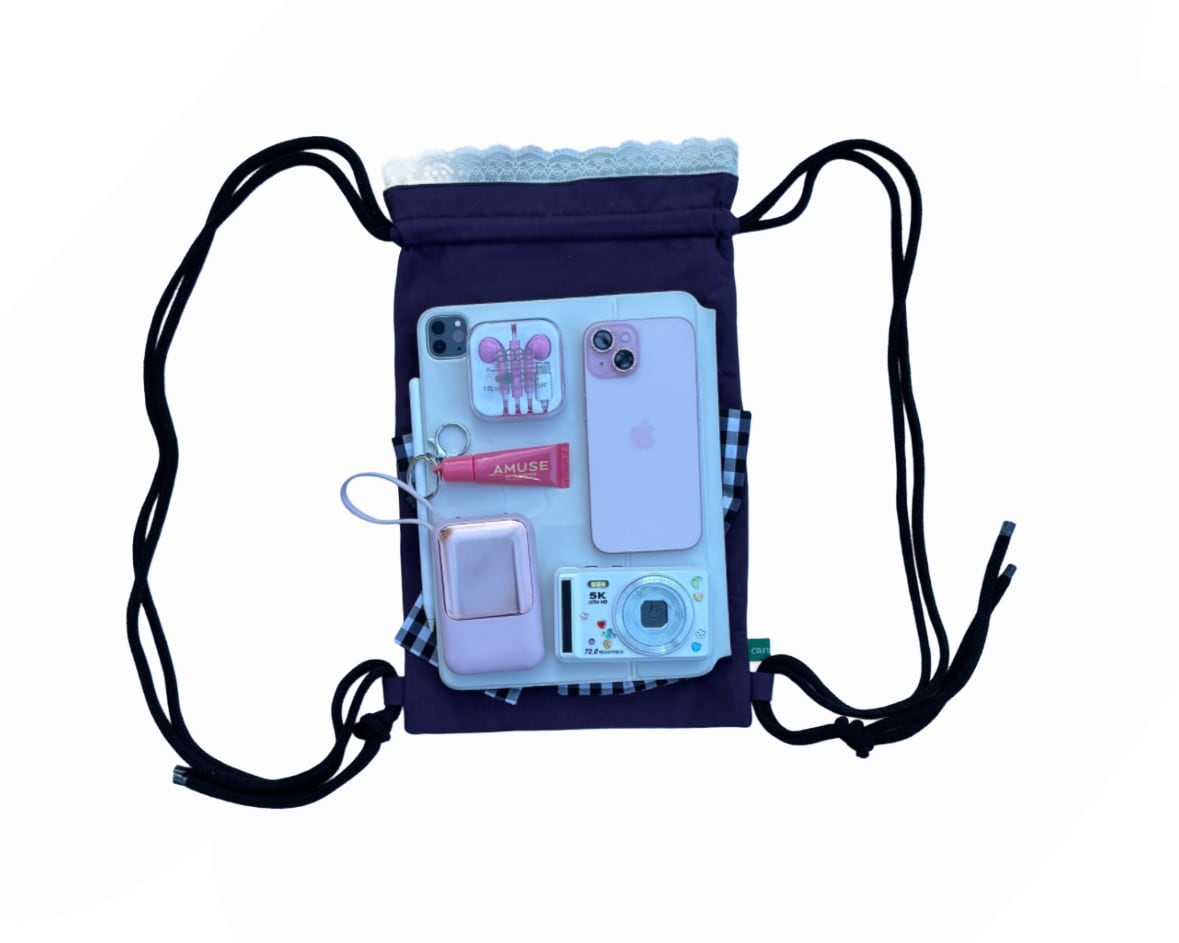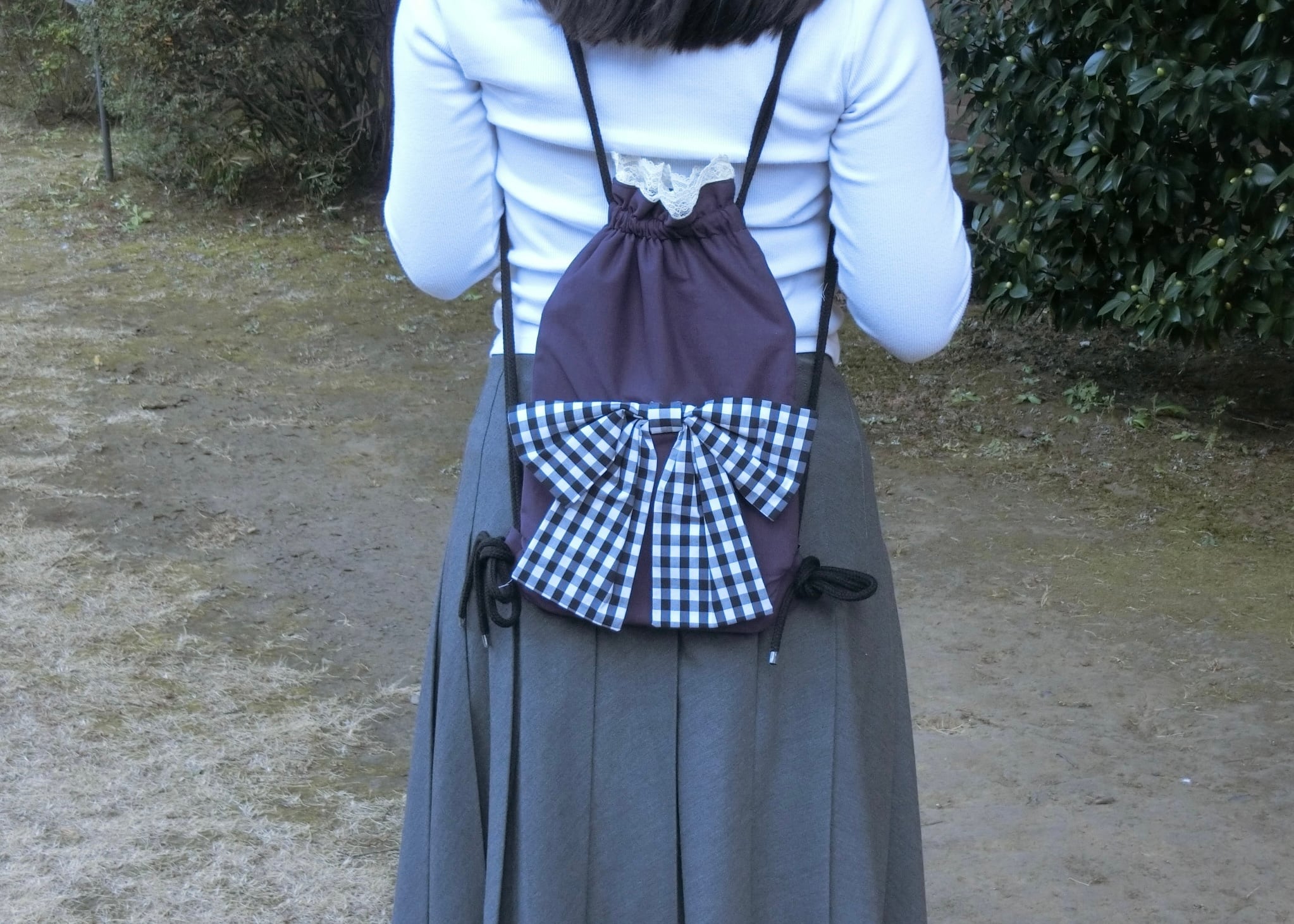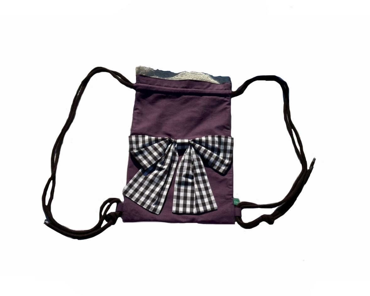 大人かわいい紫にギンガムチェックの大きめのリボンが映えるナップザックです。