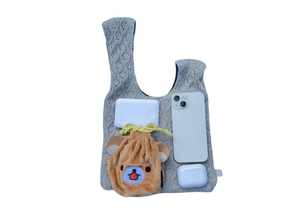 若草色のニットから作られたワンハンドルバッグです。色がシンプルなのでどのような服装にも合わせやすい一方で、透かし編みの生地がコーディネートに春らしい軽やかさを追加してくれます。
