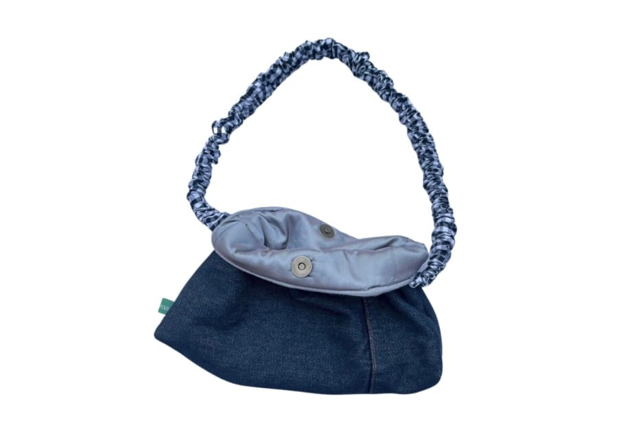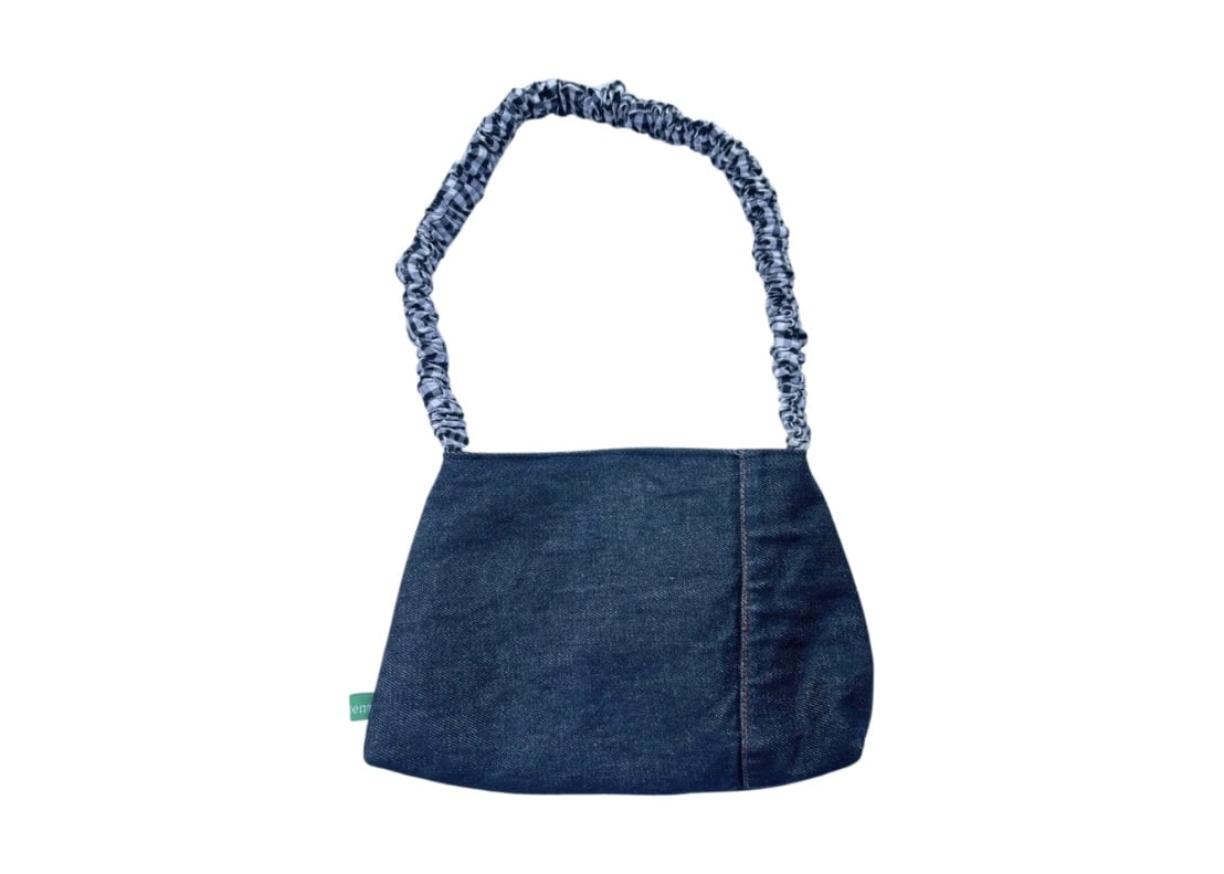 デニム生地とチェックの生地からできたくしゅくしゅバッグです。色味はシンプルですが、取手のチェック柄がアクセントになっています!財布やスマホなどがしっかり収納できるサイズなので、お出かけにぜひ!