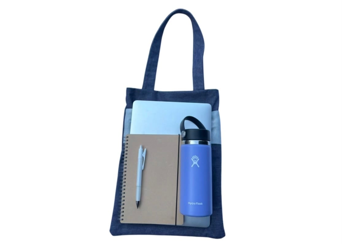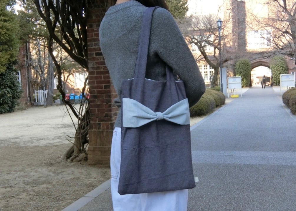 デニム生地からつくられたトートバッグです。大きな水色のリボンが可愛らしいバッグですが、色味がシンプルなのでどのようなコーディネートにも合わせやすいです。春からの通学用のバッグとしてもぜひ!