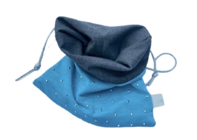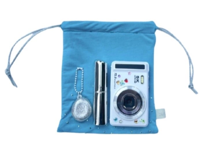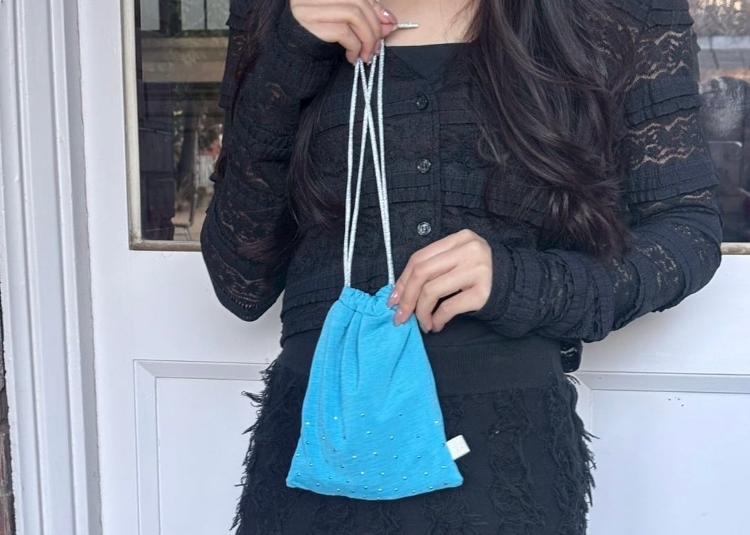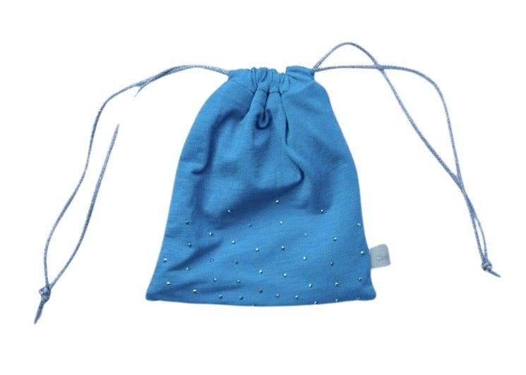 小さなスタッズがついた水色のトップスから作られた巾着です。名前の通りの星のようなキラキラとしたパーツが心をときめかせてくれること間違いなしです。小物やコスメの整理整頓にちょうど良いサイズ感です。